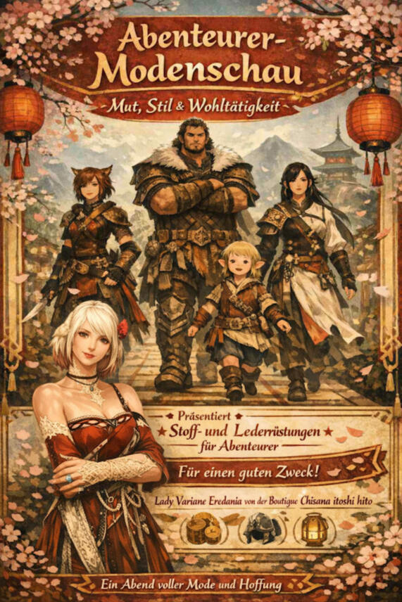 Im dritten Schattenmond fand die erste Modenschau statt.Variane Eredania präsentierte eine kleine Kollektion: stilvolle Outfits aus edlen Stoffen, liebevoll entworfen für jeden Anlass. Im Anschluss an die Modenschau wurden die gezeigten Stücke versteigert. Zusätzlich wurde der finale Erlös noch von Variane verdoppelt und dem Waisenhaus in Ul’dah gespendet.Damit wurde jede Stimme für Mode auch eine Stimme für Hoffnung und Fürsorge.
